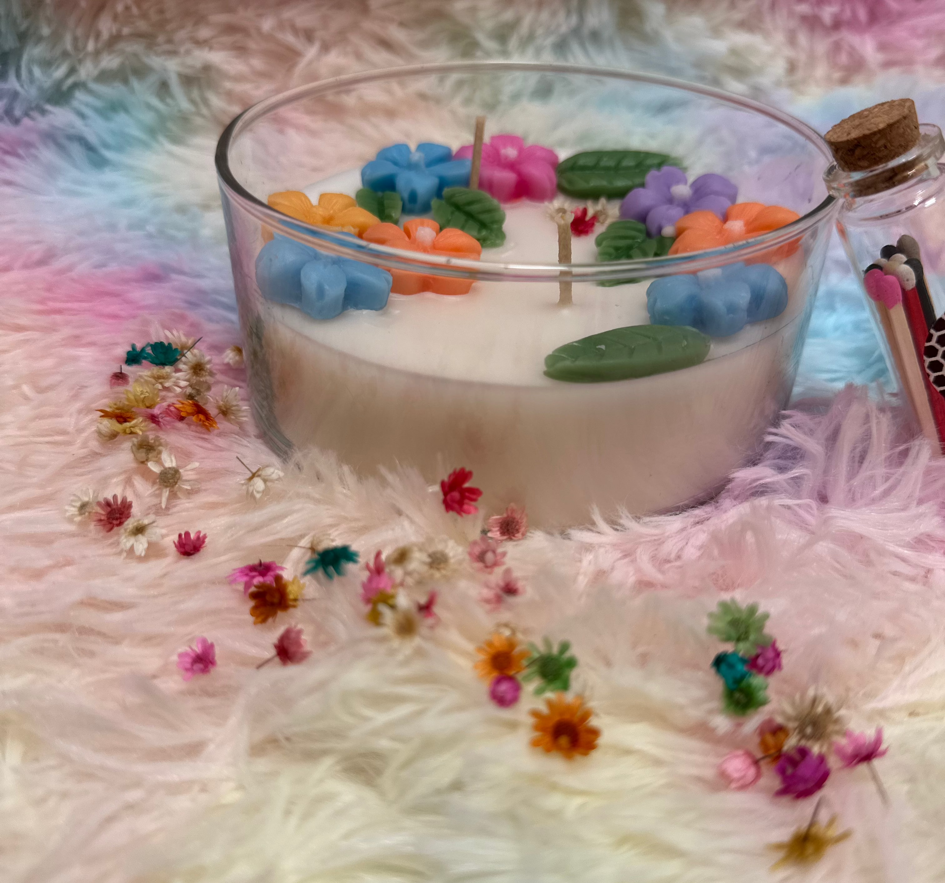 | Design | This stunning floral candle features a bowl filled with smooth wax, surrounded by vibrant, colorful flowers and lush leaves. The beautiful arrangement creates a natural, garden-inspired look that brings a fresh and lively touch to any space. |