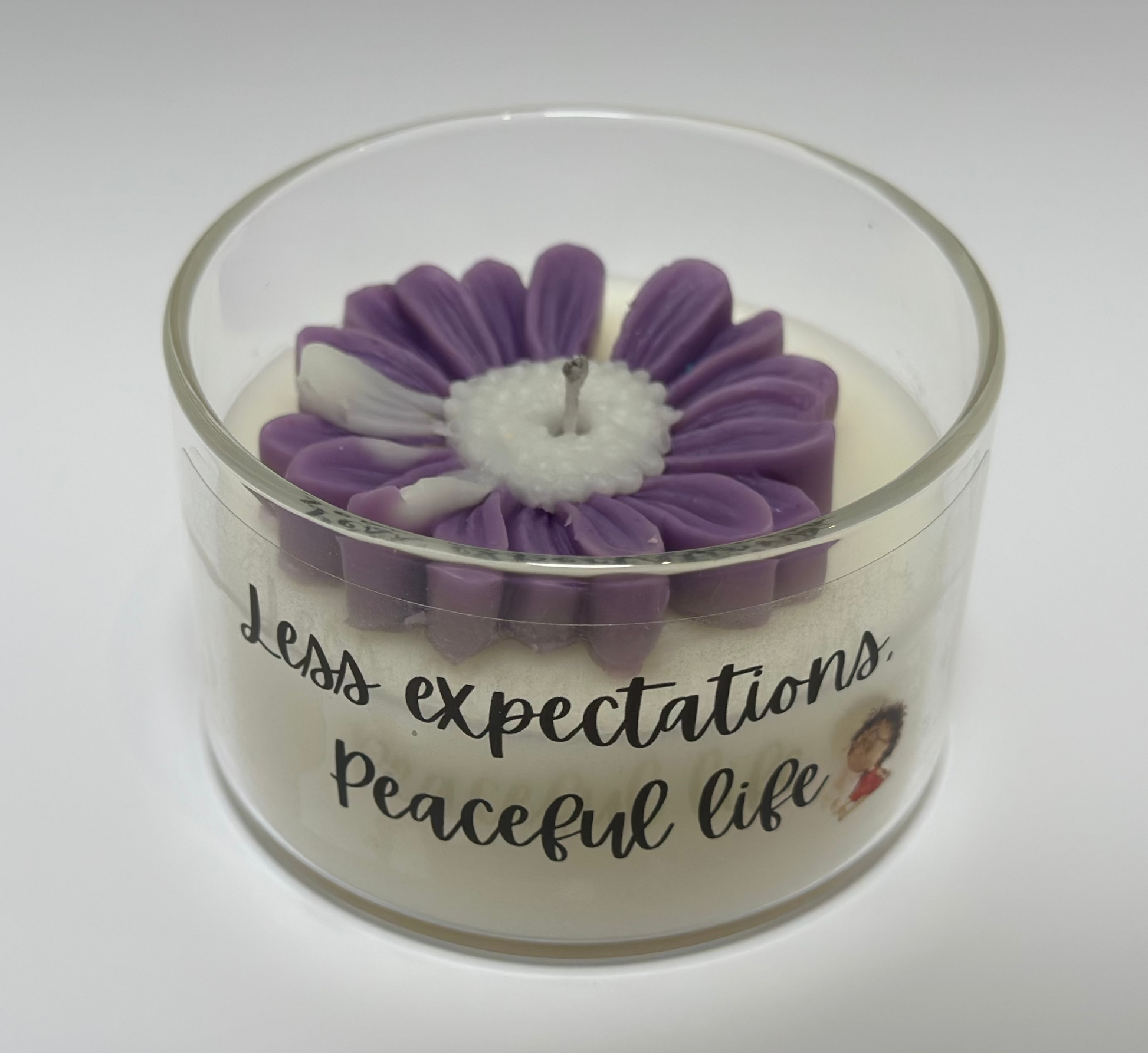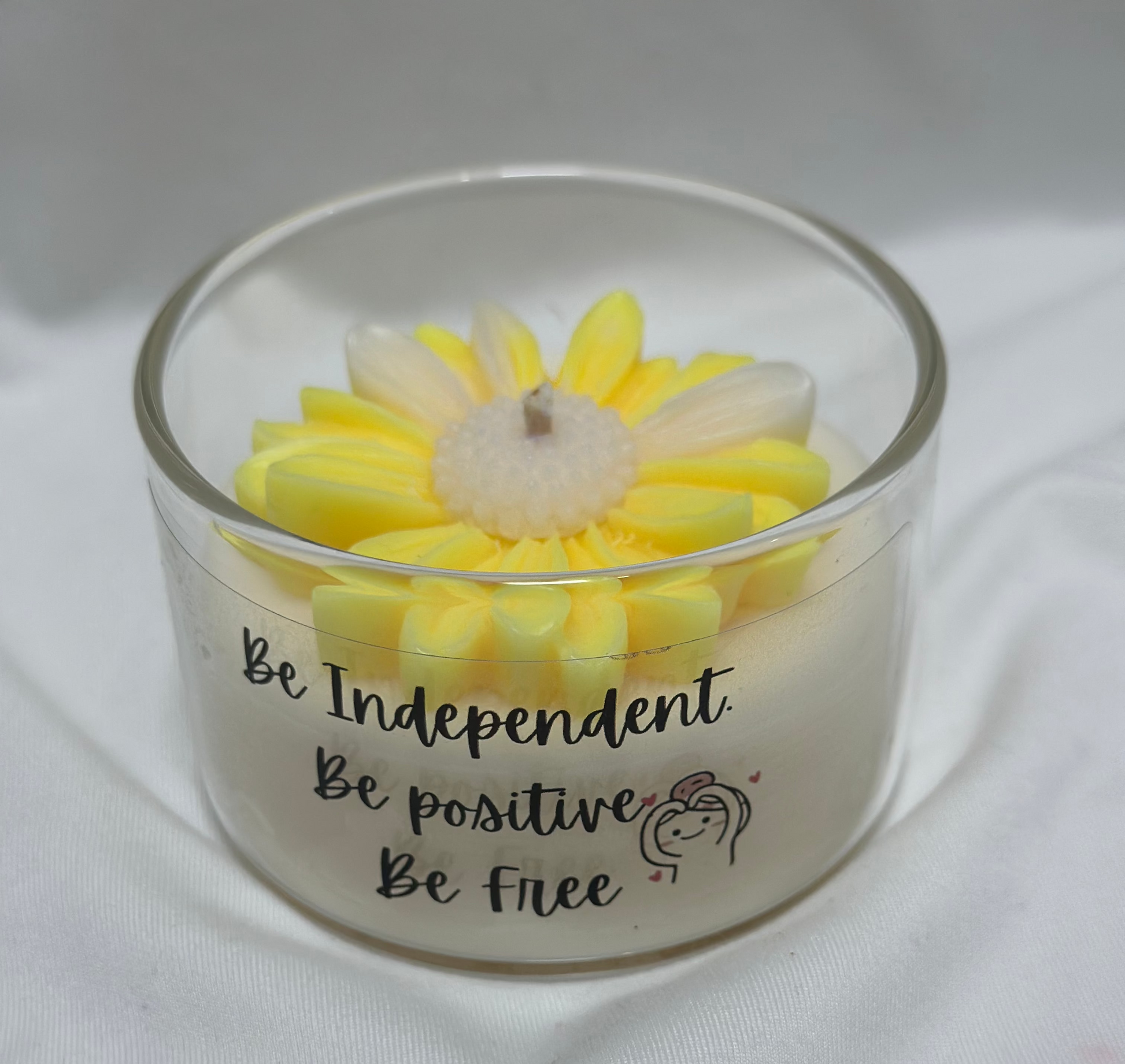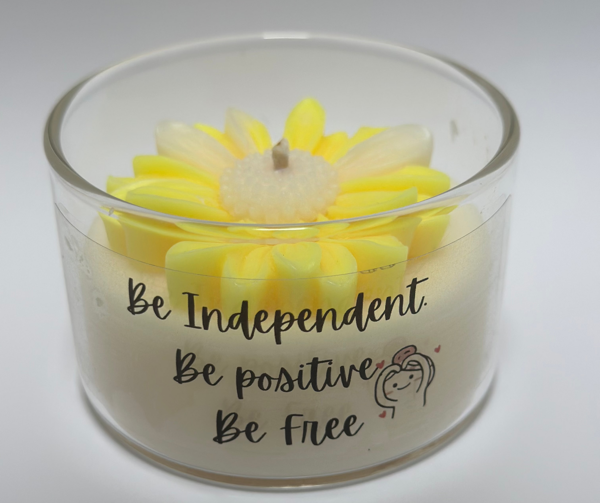 | Design | This candle features a vibrant, colorful flower design on top, complemented by a motivational quote sticker on the jar. The design adds a cheerful and inspiring touch, making it perfect for brightening any room or mood. |